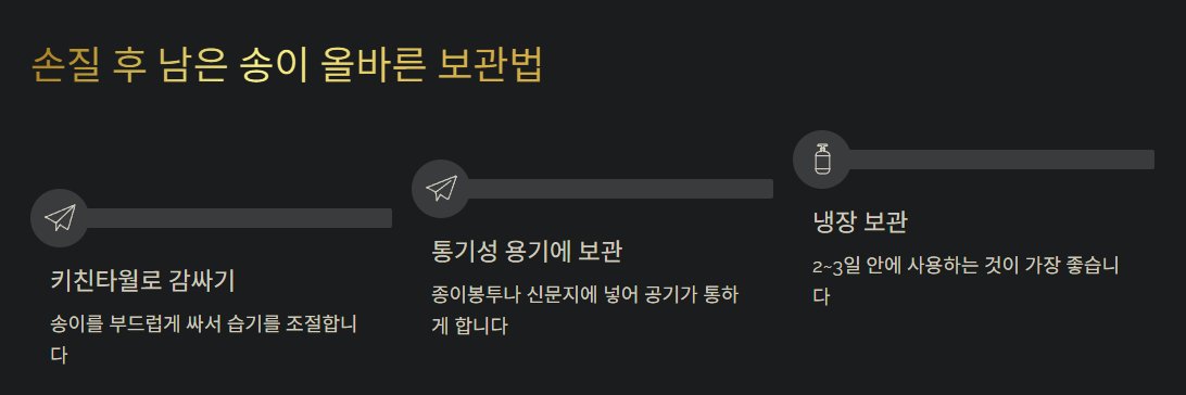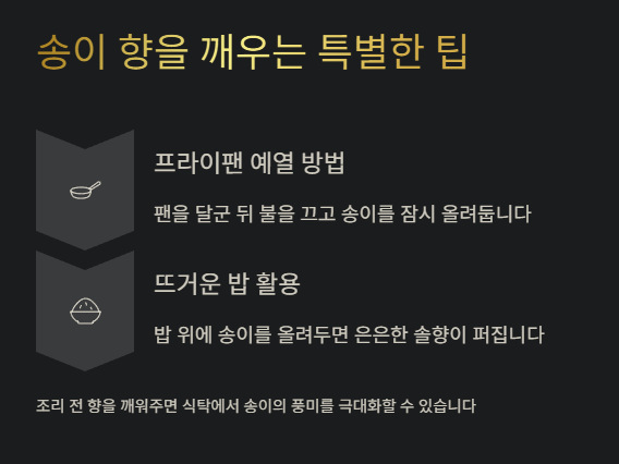 - ⚠️ 향이 약해졌다면 조리 시 간을 최소화: 송이 자체의 향을 살리려면 소금, 간장 등 강한 양념은 피해야 합니다.
