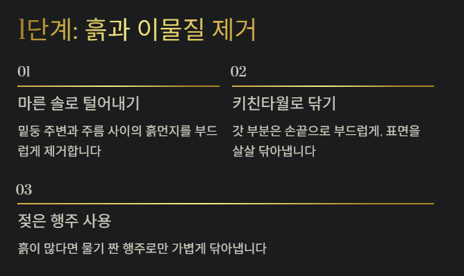 흙이 너무 많더라도 물로 씻지 말고, 젖은 행주를 살짝 적셔 닦는 수준에서 마무리합니다.